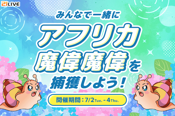 【21LIVE】梅雨本番!『アフリカ魔偉魔偉を捕獲しよう!』プライズには、フランス産エスカルゴ&人気ライバー称号バッジをご用意♪