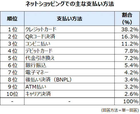 2位:QRコード決済(16.3%)、3位:コンビニ払い(11.2%)、5位:デビットカード(7.8%)、5位:代金引き換え(7.2%)、6位:銀行振込(5.4%)、7位:電子マネー(4.2%)、8位:後払い決済(BNPL)(3.4%)、9位:ATM払い(3.2%)、10位:キャリア決済(2.6%)