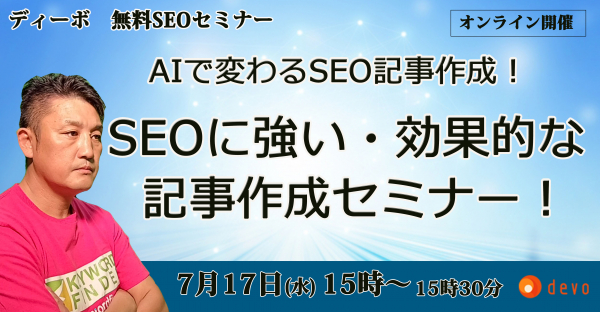 SEO対策セミナー2024年7月17日(水)15時開催! 〜AIで変わるSEO記事作成!SEOに強い・効果的な記事作成セミナー!〜