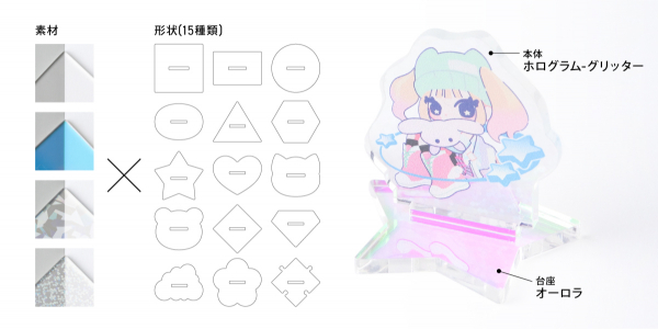 アクリルスタンドでは、デザインに沿ってカットラインを自動で作成することが可能です。台座の形状は豊富に用意しており、本体と台座で違う素材を選ぶことも可能です。お好みに合わせて形状と素材をカスタマイズできるため、唯一無二のアクリルスタンドが作成できます。