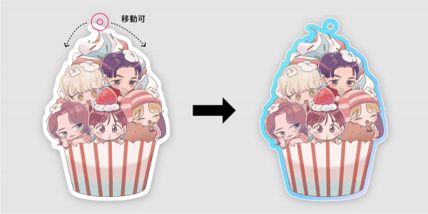 アクリルキーホルダーは、自由形と定形の2つの形状からお選びいただけます。自由形を選択した場合、カットラインに沿ってキーホルダーの穴をご希望の位置に配置できます。