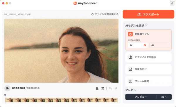 低解像度の動画を4Kなどの高解像度に変換し、ぼやけた映像も鮮明にします。この自動処理により、古くて粗いビデオが新たな魅力を放ちます。