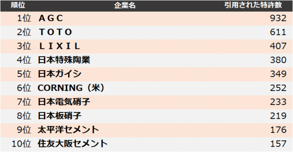 集計の結果、2023年に最も引用された企業は、1位 AGC、2位 TOTO、3位 LIXILとなりました。