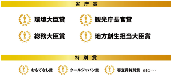 省庁賞・特別賞 :環境大臣賞、地方創生担当大臣賞、総務大臣賞、観光庁長官賞、特別賞(10賞程度)