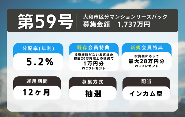 新たに募集する利回り不動産第59号ファンド「大和市区分マンションリースバック」は、神奈川県大和市の区分マンション1戸を、リースバック(売主が賃借人として居住を続ける)により取得し、賃貸物件として運用するファンドです。インカムゲイン5.2%(年換算)の分配を目指します。なお、運用開始から6か月後を基準日として中間分配を予定しております。