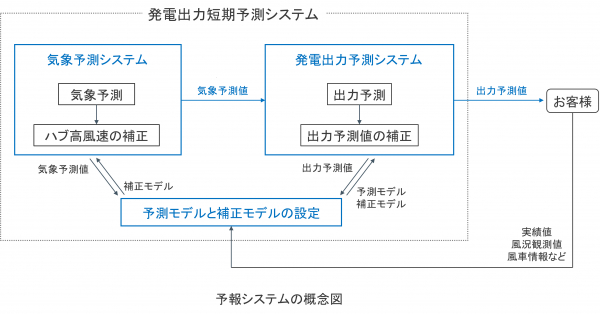 独自に運用する高解像度の気象予測システムにより,風車位置ハブ高の風速・風向を予測します。過去の風速観測値を用いて風速の補正モデルを設定し,予測値を補正します。