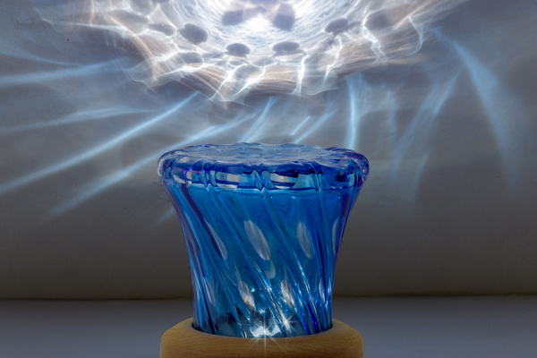 手造りのガラスに切子で朝顔を表現した、ポータブルランプ。壁や天井に広がるあたたかな光が、癒しのひとときを提供してくれます。