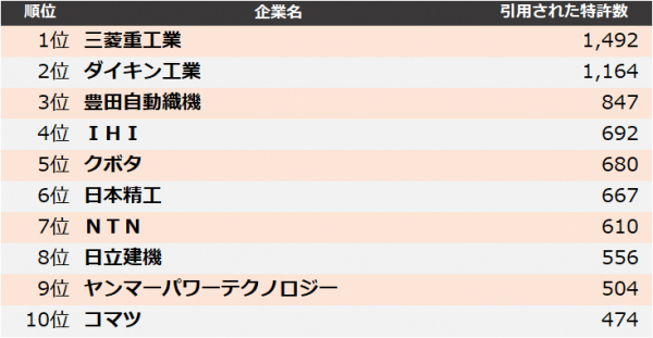 集計の結果、2023年に最も引用された企業は、1位 三菱重工業、2位 ダイキン工業、3位 豊田自動織機となりました。