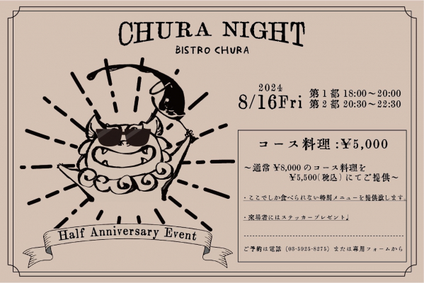 オープン半年の記念として、いつも当店をご利用いただいているお客様へ感謝の想いを込めまして、「CHURA NIGHT」を開催いたします。