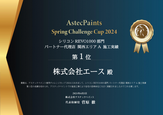 当社には一級塗装技能士やカラーコーディネーターがおり、技術への安心感や、近年増えている塗装のデザインも可能なことから実績を伸ばし、これまで4,236棟を施工。遮熱塗料に力を入れる塗料メーカー「アステックペイント」のシリコンREVO1000部門で関西エリア1位になりました。