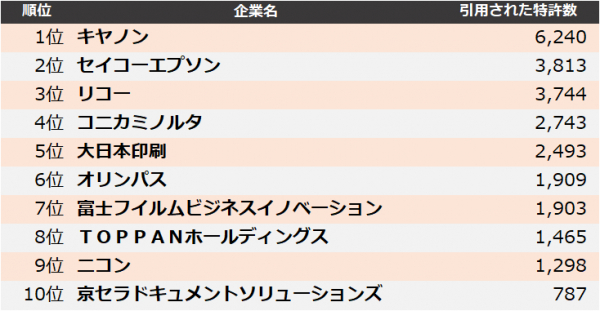 集計の結果、2023年に最も引用された企業は、1位 キヤノン、2位 セイコーエプソン、3位 リコーとなりました。