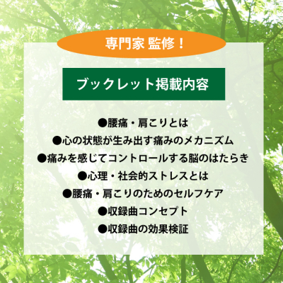 ブックレットには、収録曲コンセプト、痛みを感じるメカニズム、腰痛・肩こり緩和のための5つの習慣、収録曲の検証結果などを掲載しています。