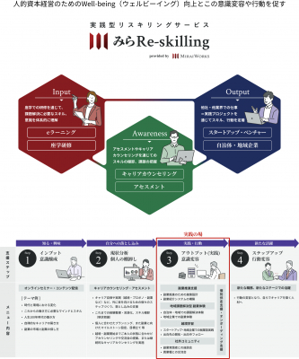 みらいワークスは、人生100年時代に、プロフェッショナル人材がライフステージに応じて、「独立、起業、副業、正社員」といった働き方や「都市、地方」といった働く場所、働く目的(*1)に縛られない挑戦の機会提供とその挑戦の支援を行うための事業を展開しています。また、法人企業向けには、社員のスキルのアップデートや Well-being(ウェルビーイング)の向上、新しい人材活用の仕組みや制度を作るための実践型リスキリングサービス『みらRe-skilling 』を提供し、企業の人的資本経営の施策として、効果的な実践型リスキリングの機会を、副業や越境教育を通じて提供しています。