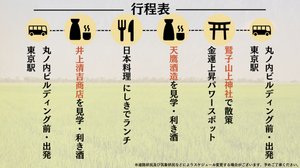 旅行代金に含まれるもの:保険代、貸切バス代、ガイド代、ランチ代(お酒を含む)、利き酒、旅のしおり、日本酒教材