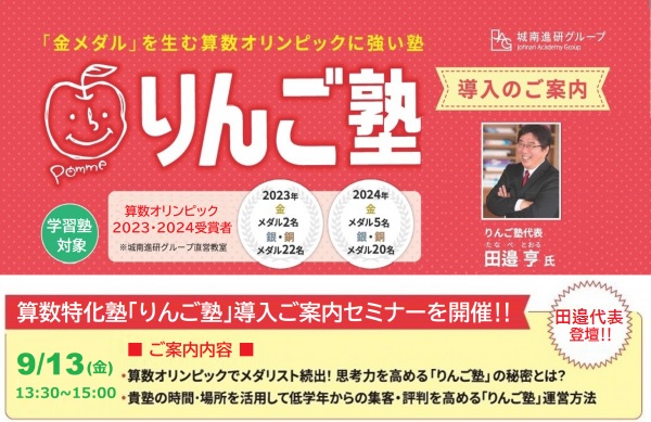 【城南進学研究社】4年連続算数オリンピック金メダリスト輩出! 塾・教育関係者向け『「りんご塾」導入ご案内ウェビナー』を9/13(金)に開催。田邉代表自ら、低学年から選ばれる理由をお話します。