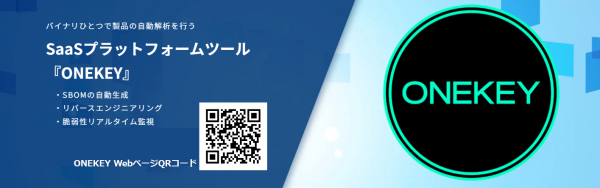 ONEKEYは、バイナリひとつで製品の自動解析を行う SaaS プラットフォームです。セキュリティ・コンプライアンス分析、自動化されたソフトウェア部品表(SBOM)による透明性の高いサプライチェーンの改善に焦点を当てたツールとして活用いただけます。