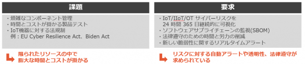 要件に当てはまる企業はセキュリティ基準の遵守が求められるため、認証機関やセキュリティベンダーが提供する試験や認証、または第三者評価等の検討が必要となります。それには製品テストの実施や煩雑な管理等による膨大な時間・コストがかかるという課題感や、リスクに対する自動アラートや透明性、法律遵守が求められ、対応企業の負担も少なくありません。