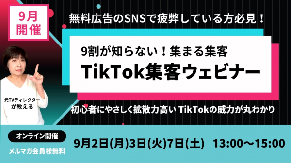 3回連続満員御礼!【9割が知らない!集まる集客(R)TikTok集客ウェビナー】初心者にやさしく拡散力高い! TikTokの威力が丸わかり 9月開催日程発表!