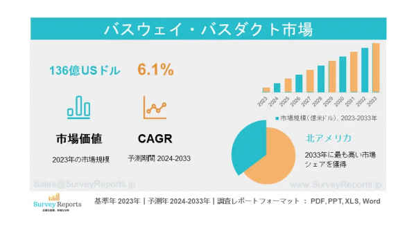 サーベイレポートの専門家たちは、バス路線バスダクト市場調査を分析し、2023年に生成されたバス路線バスダクト市場規模が136億米ドルであることを明らかにしました。また、バスウェイダクト市場のシェアは、2033年末までに236億米ドルに触れる収益を予見しています。バスウェイダクト市場は、2024年と2033年の予測期間中に約6.1%のCAGRで成長することが提案されています。