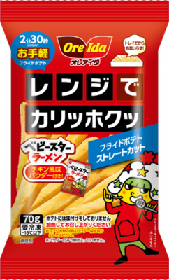 カリッホクッ食感が楽しめるストレートカットのレンジポテトに、ロングセラーの「ベビースターラーメンチキン味」風味のシーズニングパウダー付き。トレーのままチンして、チキンと野菜のうまみが凝縮したパウダーをかけて食べます。