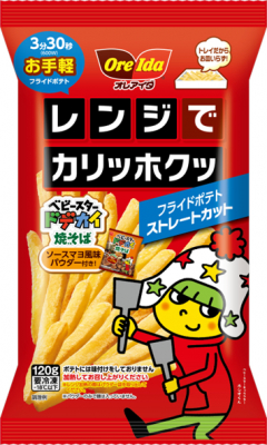 新商品の冷凍フライドポテト2品は、「オレアイダ レンジでカリッホクッ フライドポテト ストレートカット 70g ベビースターラーメンチキン風味シーズニング付き」、「オレアイダ レンジでカリッホクッ フライドポテト ストレートカット120g ベビースタードデカイ焼そば ソースマヨ風味シーズニング付き」です。「オレアイダ」ブランドのレンジポテトシリーズは、トレーのままレンジで加熱するだけでカリッホクッとした食感のおいしいフライドポテトができる手軽さから、人気の商品となっています。新商品では、定番のストレートカットのフライドポテトに、レンジ加熱後、付属のベビースターコラボのシーズニングパウダーをかけると、いつものポテトが簡単に味変できます。チキン風味パウダーは、発売以来ロングセラー商品の「ベビースターラーメンチキン味」を表現し、チキンと野菜のうまみ豊かな味わいです。ソースマヨ風味パウダーは、「ベビースタードデカイ焼そばソースマヨ味」を表現し、トロッと濃厚なソース味にほどよい酸味のあるマヨネーズ風味で、甘み・コク・香ばしさが後引く味わいです。いずれもベビースター人気の2つのフレーバーで、おやつだけでなく、おつまみにも最適です。