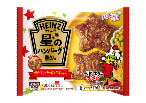 冷凍ハンバーグの新商品「ハインツ 星のハンバーグ屋さん ベビースターラーメンチキン味入り」は、9月より新発売する「ハインツ 星のハンバーグ屋さん」シリーズの期間限定ラインアップとして発売します。牛、鶏、豚肉を細かく挽き、かわいい星形にしたハンバーグです。「ハインツ 星のハンバーグ屋さん ベビースターラーメンチキン味入り」には、チキン味のベビースターラーメンを練りこみ、ソースをかけずそのままでもチキンとうまみが広がる味わいです。子どもの昼食や夕食のおかずはもちろん、パーティーの1品やお弁当の材料としてもおすすめの商品です。