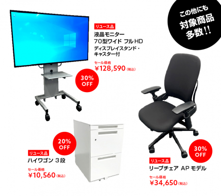 “決算セール”では、質の高いリユース品から3種の目玉商品をピックアップ。通常販売価格から20%〜30%OFFで販売いたします。(下記でご紹介する目玉商品以外にもお得な商品を多数取り揃えています)