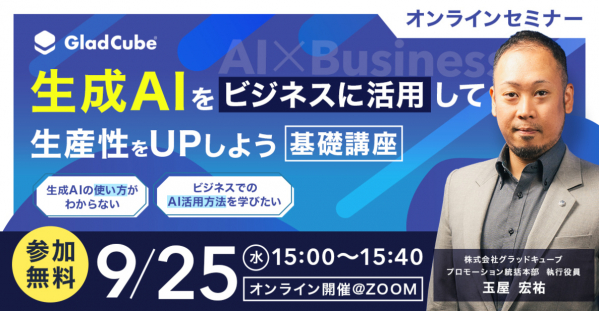 株式会社グラッドキューブ(本社:大阪市中央区 代表取締役 CEO 金島 弘樹 以下:グラッドキューブ)は、2024年9月25日(水)15:00よりオンラインセミナーを開催いたします。