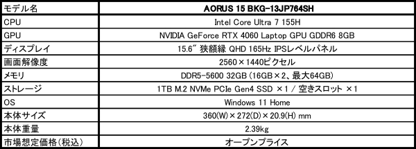 GIGABYTE、Intel Core Ultra 7プロセッサと大容量メモリを搭載した15.6型AIゲーミングノートPC「AORUS 15」家電量販店モデルを発売