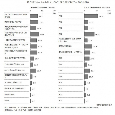 次に、英語を学ぶ方法として、英会話スクールとオンライン英会話を選んだ理由(複数回答)を尋ねた。英会話スクールを選んだ理由としては、「自分の理解レベルに合わせて指導してもらえる」が35.0%、「講師の指導レベルが高い」33.5%、「リーズナブルな料金でサービスを受けられる」30.5%が上位3位までの回答だった。