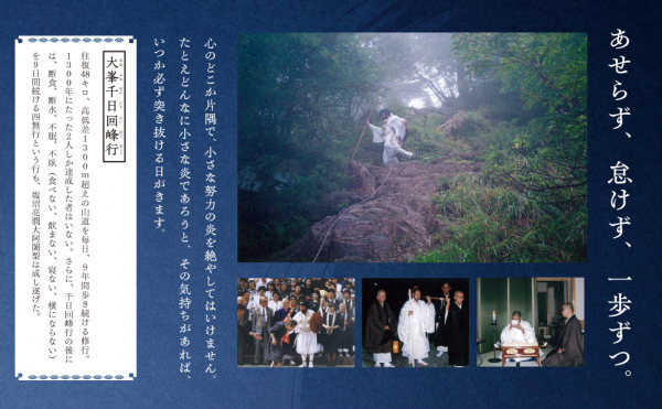 99年に金峯山寺1300年の歴史で二人目となる一日48kmの険しい山道を千日間歩き続ける「大峯千日回峰行」を満行。