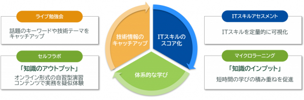 ITアセスメントツールによる「ITスキルのスコア化」、複数のキャリアパスの中から学習の目的や課題にあわせて選択できる知識習得型コンテンツと擬似的に業務を体験できる演習型コンテンツによる「体系的な学び」、さまざまなテーマに沿った「ライブ勉強会」で、効率的かつ効果的なスキル習得をサポートします。