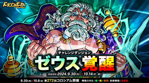 株式会社アソビズム(本社:東京都千代田区、代表取締役:大手智之)は、App Store・Google Playにて好評配信中のリアルタイム合体カードバトル『ドラゴンポーカー』で、2024年9月30日(月)よりチャレンジダンジョン「ゼウス覚醒」を開催いたします。