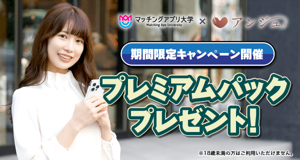 『アンジュ』の「プレミアムパック」を手に入れるための合言葉は『マッチングアプリ大学』キャンペーンページ内でお知らせしています。