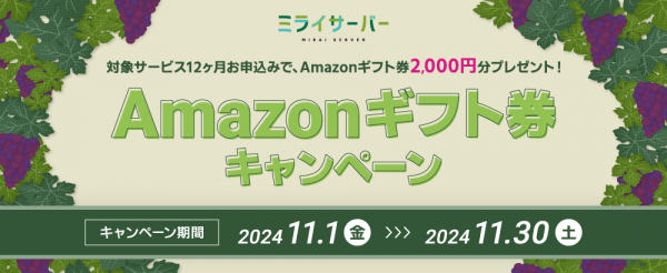 ミライサーバー(運営会社:アシストアップ株式会社、所在地:大阪府大阪市、代表取締役:青木 勝彦)は、2024年11月1日(金)〜2024年11月30日(土)の期間、Amazonギフト券キャンペーンを実施いたします。