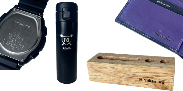 名入れ加工はレーザーで行いますので、革、金属、木材、ガラスなど様々な素材に対応しており、複雑なデザインや細かい文字も再現可能です。