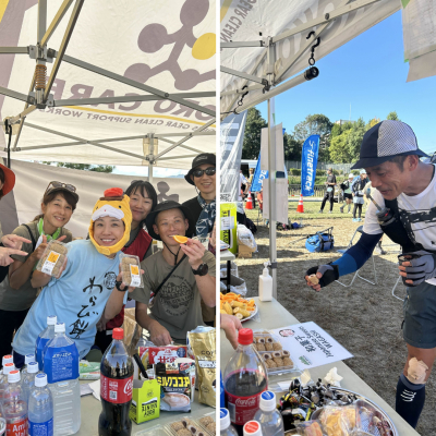 明日香野は西日本地域で販売中の「秋のわらび大福」、「大人の団子(三色・よもぎ使用)」、「ごまだんご」などをエイドでふるまい、選手を後押ししました。