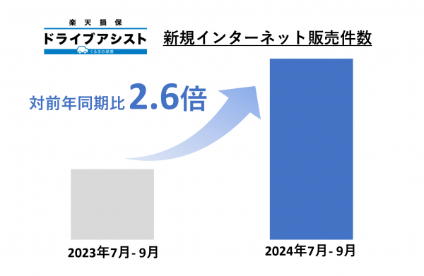 楽天損害保険株式会社(以下「楽天損保」)は、個人用自動車保険「ドライブアシスト」(以下「ドライブアシスト」)の2024年7月から9月における新規インターネット販売件数が対前年同期比で2.6倍となりましたことをお知らせします。