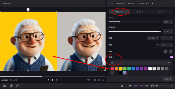 次に、画面のAIツールバーから「背景を除去する」っていうボタンを押すんで,そうすると、自動的に動画の背景が消えていきます。(出来上がりは画像の通りです。)