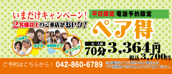ペア得キャンペーン!は電話予約限定で平日おひとり様70分が3,700円(税込)とお得なキャンペーンです!