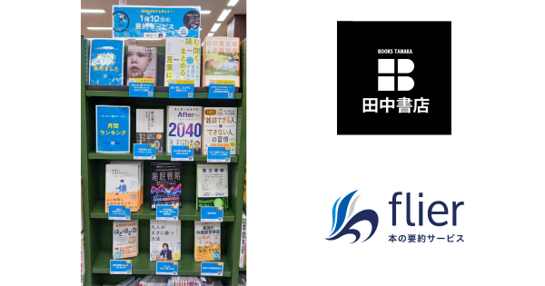 累計会員数120万人を突破した本の要約サービス「flier」を運営する株式会社フライヤー(本社:東京都千代田区、代表取締役CEO 大賀康史)は、宮崎県都城市で書店を展開している田中書店 株式会社(本社:宮崎県都城市、代表取締役 田中義久)と業務提携を実施し、田中書店にて「flier」フェアを11月1日(金)から12月31日(火)まで実施することをお知らせします。今後は展開書籍を定期的に入れ替えながら、継続的に棚を展開していく予定です。