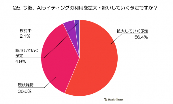 「縮小していく予定」(4.9%)や「検討中」(2.1%)といった回答は少数にとどまり、AIライティングツールへの高い関心が見受けられます。