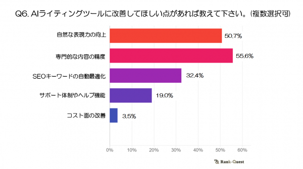 Q6において、最も多かった回答は「専門的な内容の精度」(55.6%)、次いで「自然な表現力の向上」(50.7%)でした。また、「SEOキーワードの自動最適化」(32.4%)や「サポート体制やヘルプ機能」(19.0%)も一定の要望が見られました。