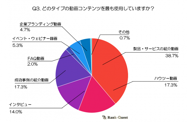最も多かった回答は「製品・サービスの紹介動画」(38.7%)で、多くの企業が自社の製品やサービスをアピールする手段として動画を活用していることが分かります。次いで「ハウツー動画」や「成功事例の紹介動画」(各17.3%)が挙げられており、これらのコンテンツが顧客の理解を深めることや、信頼を築くために効果的なツールとして位置づけられていることが示唆されています。