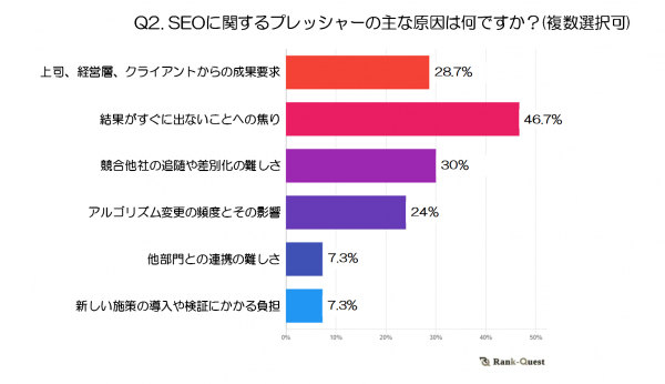 最も多かった回答は「結果がすぐに出ないことへの焦り」(46.7%)で、多くのSEO担当者が成果がすぐに見えないことに対してプレッシャーを感じていることがわかります。