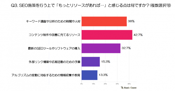 最も多かった回答は「コンテンツ制作や改善に充てるリソース」(42.7%)で、多くのSEO担当者がコンテンツの質を高めるためのリソース不足を感じていることがわかります。