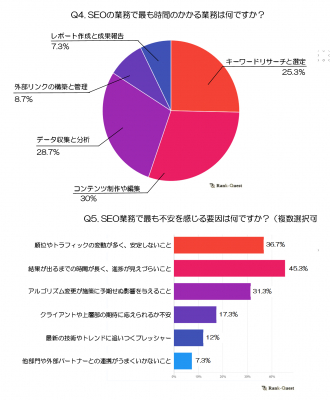 Q4において、最も時間のかかる業務として挙げられたのは「コンテンツ制作や編集」(30%)で、多くのSEO担当者が質の高いコンテンツの作成・編集に多くの時間を費やしていることがわかります。