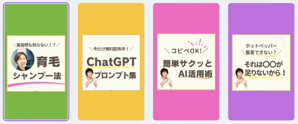 個人起業家の皆さんで、表紙がうまく作れない方のために、Canvaで作成したリール専用のカバー画像のテンプレート「緑、黄色、ピンク、紫」の4色をセットにして配布中です。