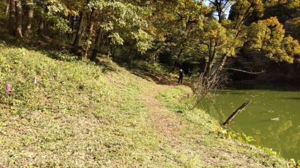 主として下草刈り、以前に植樹したコナラの苗木保護のために目印をつけるなど整備を行いました。