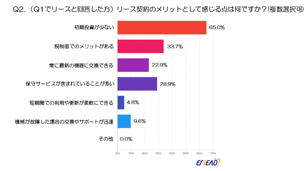リース契約のメリットとして最も多く挙げられたのは「初期投資が少ない」で、65%の回答を得ています。次いで、「税制面でのメリットがある」が33.7%、「常に最新の機器に交換できる」が22.9%、「保守サービスが含まれていることが多い」が28.9%という結果でした。